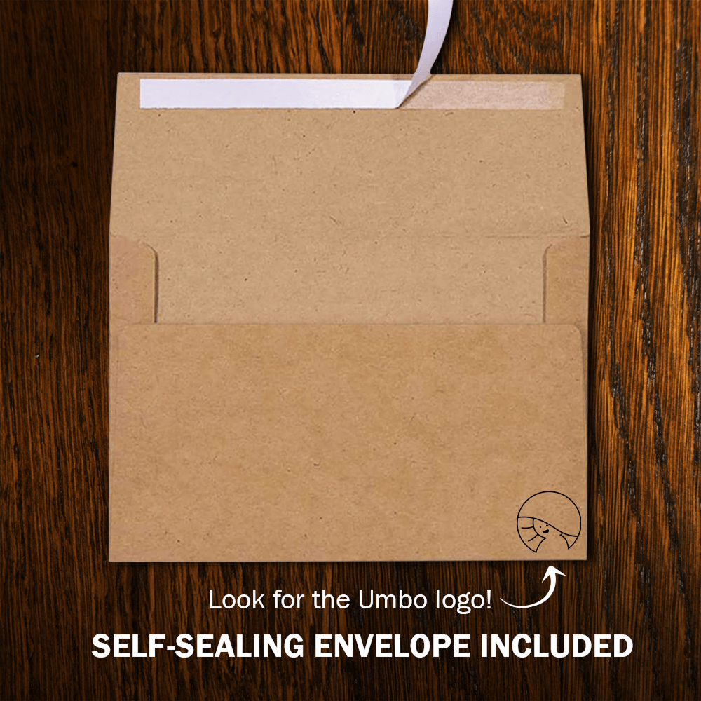 Umbo Rubys are hand-inked and printed on premium heavyweight cardstock in Portland, OR. And, every card comes in a rigid mailer with resealable sleeve (for gifting) and self-sealing envelope - no icky licky!