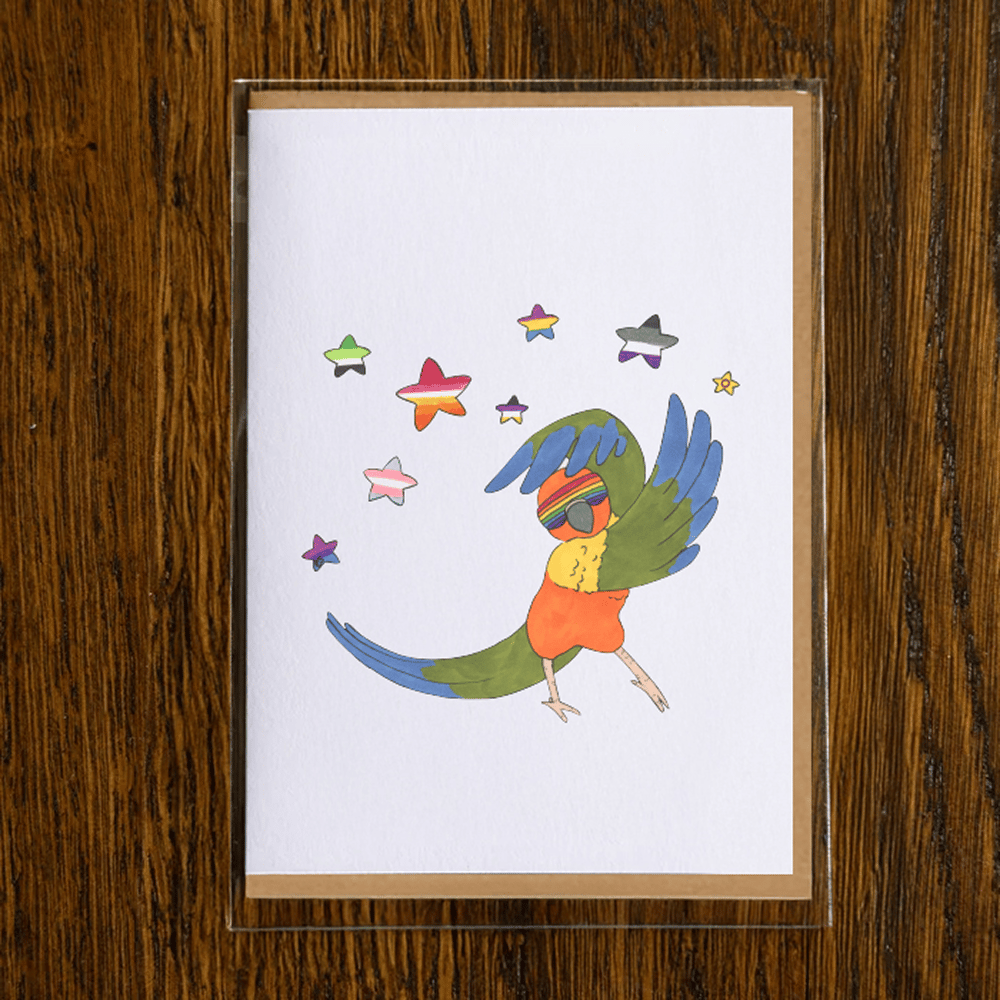 Sun conures (Aratinga solstitialis) fluff their flashy feathers with pride. Send Ruby to celebrate friends with sass n’ class.